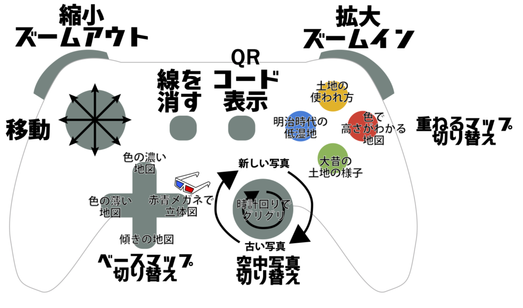 - 奥の方にあるボタンで上にあるもの(LB、RBボタン)はズームインとズームアウトを行います。