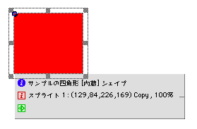 しかし今度からはステージ上に必要な情報が表示されるようになった。この小さなウィンドウがとても便利。すべてのスプライトにこのようなウィンドウを表示させることも可能であるらしいが、かなりにぎやかなステージになるだろう(笑)。このような小さなウィンドウはPhotoshp4からも採用されているが、ユーザーの立場に立ったインターフェイスの良い例として一般化すると思われる。