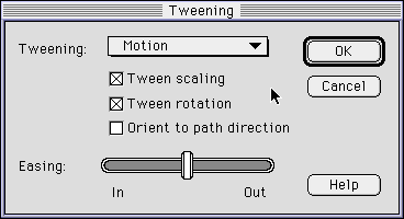 いよいよ核心に迫ってきました。では1フレーム目にカーソルを持っていき、プレスして下さい。こんなメニューが出てきます。そしてTweenを選択して下さい。新しくウィンドウが開きますので、そこでTweeningメニューをMotionを選んで下さい。とりあえずはO.K.を押してみて下さいね。