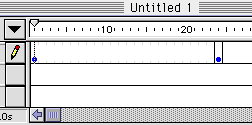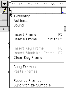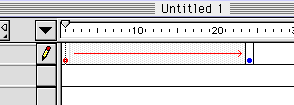 まずはフレームを足してやりましょう。ええと、質問がくると思うので、先に説明しておきますけど、FlashはDirectorのようにはじめから時間の概念があるわけではないんです。簡単にいうと、ムービーの長さの分だけフレームを足していく必要があるのです。ですからキーフレームよりも先に、フレームを挿入しましょう。たとえば適当に24フレーム目あたりでフレームを足してみましょう。下のような位置にカーソルを持っていき、マウスボタンをプレスして下さい。びろ〜んとメニューが出てきましたね。そこでInsert Frame(フレームの挿入)を選択して下さい。
